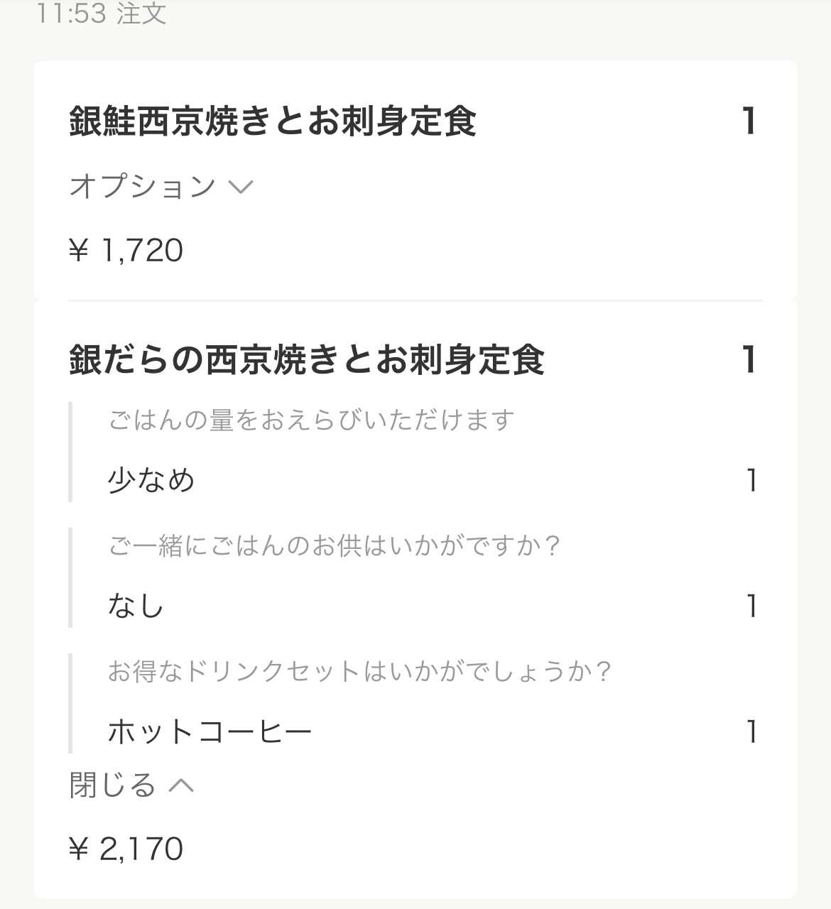 料理1つにつき、ドリンクも1つなのですね。夫の料理をキャンセルしてやり直せば良かったのかも。