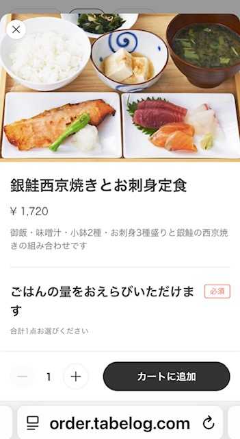 夫は、銀鮭西京焼きとお刺身定食。ご飯の量は普通。1,720円。