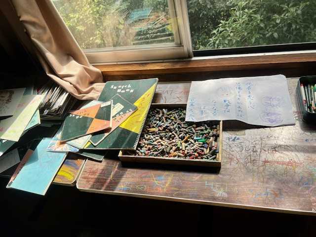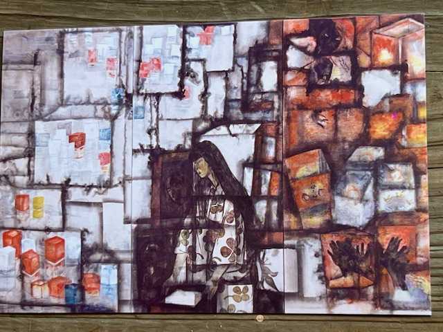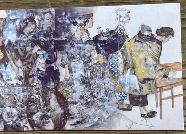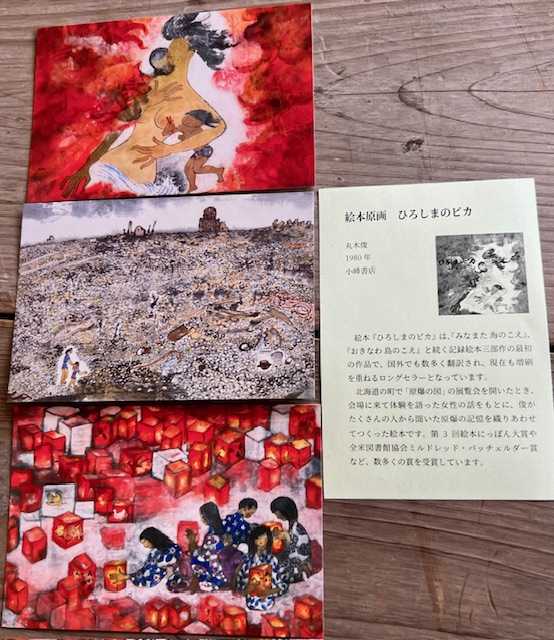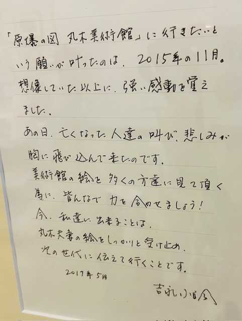 この絵をみて、「わたしの娘はクラスでたった一人生き残ったのです。けれど手はひっついて内側へまがり、顔ものどもひっついてしまい、歩くことも出来ませんでした。からだは十三才のそのときのまま成長しないのです」と被爆した大工さんは話してくれました。」