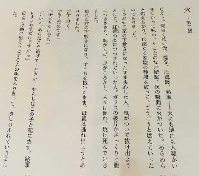 うつぶせて家の下敷きになったまま失心した人、気がついて抜け出ようとして、紅蔵の炎につつまれていった人。ガラスの破片がざっくりと腹につきささり、腕がとび、足がころがり、人々は倒れ、焼け死んでいきました。