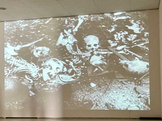 「足の方を外側にして、頭を中心にして、死体の山がありました。眼や口や昇がなるべく見えないように積み重ねてあったのです。