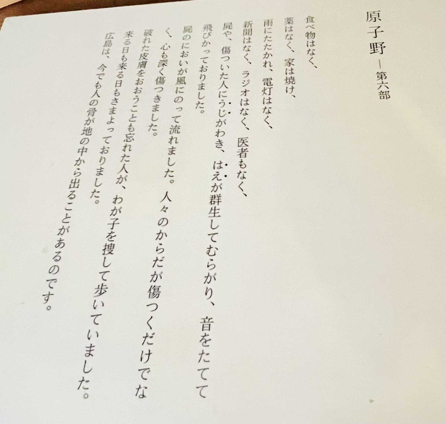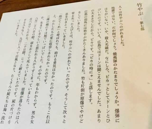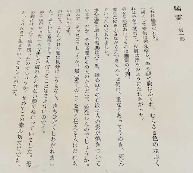 一瞬にして着物は燃え落ち、手や顔や胸はふくれ、むらさき色の水ぶくれはやがて破れて、皮膚はぼろのようにたれさがった。