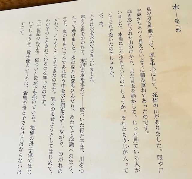 「流れに沿い、頭を並べて水をしたい、そうして累々とつらなり死んでおりました。末期の水は、川辺までたどりついてもまだずっと下の方でしたから、水ものまずに息を引きとったのです。