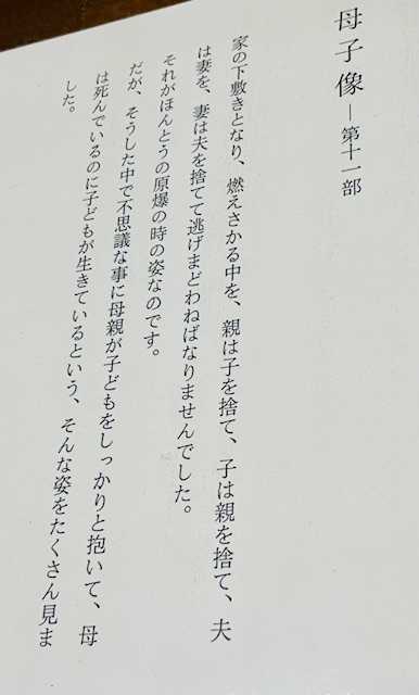 赤ん坊がたった一人で美しい膚のあどけない顔でねむっていました。母の胸に守られて生き残ったのでしょうか。せめてこの赤ん坊だけでも、むっくり起きて生きていってほしいのです。」