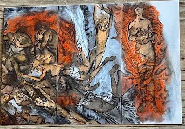 燃える炎をのがれて、末期の水を求めてー傷ついた母と子は、川をつたって逃げました。水の深みに落ち込んだり、あわてて浅瀬へのぼり、走り、炎が川をつつんであれ狂う中を水に頭を冷やしながら、のがれのがれて、ようやくここまできたのです。乳をのませようとしてはじめて、わが子のこときれているのを知ったのです。