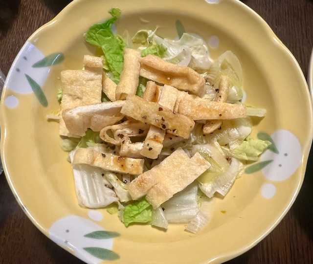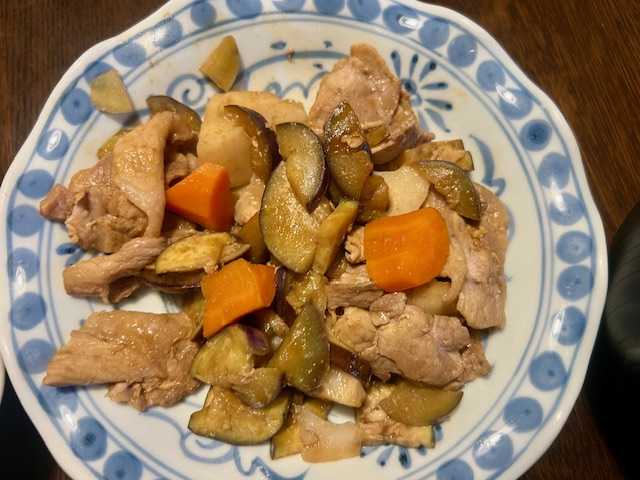 夕食は、豚・茄子・蓮根・人参の黒酢あんかけ、油揚げ・白菜・ネギのオイスターソース掛け、南瓜煮、小松菜・しめじの味噌汁、洋梨。
