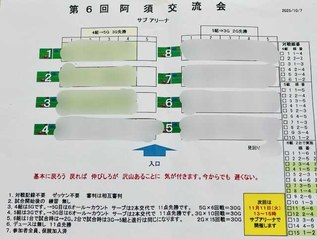 2025年09月09日XML #卓球 #阿須交流会 のシングルスに参加。3勝1引き分け同率1位。2-0,2-0,2-0,1-1 KAさんと最後の試合中、時間切れで引き分けでした。KAさんとはフルゲームで勝ったり負けたりですね。初中級試合練習会やGGクラブ大会で当たりました。