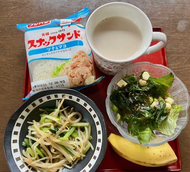 朝食(ブランチ)は、スナックサンド・ツナ&マヨ、カフェオレ、バナナ、小松菜・モヤシ炒め、薩摩芋煮、チーズ・枝豆・サニーレタスサラダ。