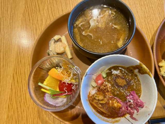 豚汁、グラタン、サラダ、2種類の相盛りカレー。