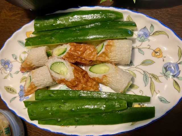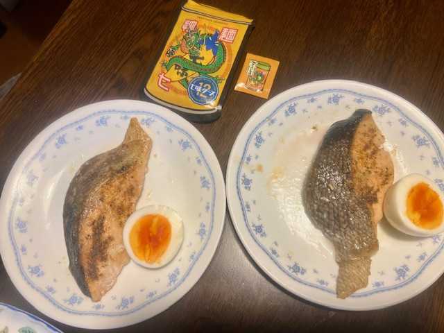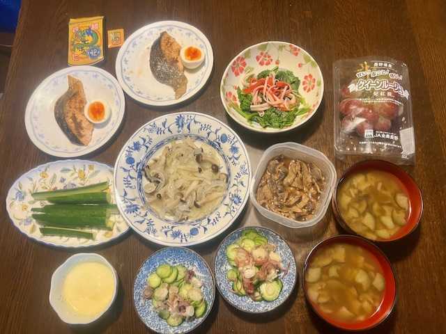 夕食は、鮭のバター・ラーメン七味焼き・半熟卵、ほうれん草・カニカマ・ポン酢、蒸しめじ・玉ねぎ、胡瓜のスティックサラダ・マヨネーズソース(ニンニク・粉チーズ)、胡瓜・茗荷、自家栽培の椎茸・にんにく醤油煮、茄子の味噌汁、ぶどう・クィーンルージュ。