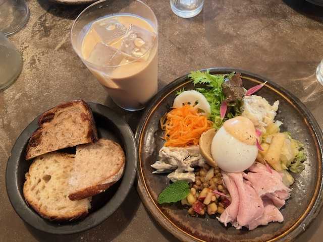 カフェ・titotenで観劇前にランチ。ウフマヨ入りプレート・パン・手づくりジャム、珈琲牛乳。美味しいし、みんな女性で、スタッフや一人客とのおしゃべりも楽しかった。