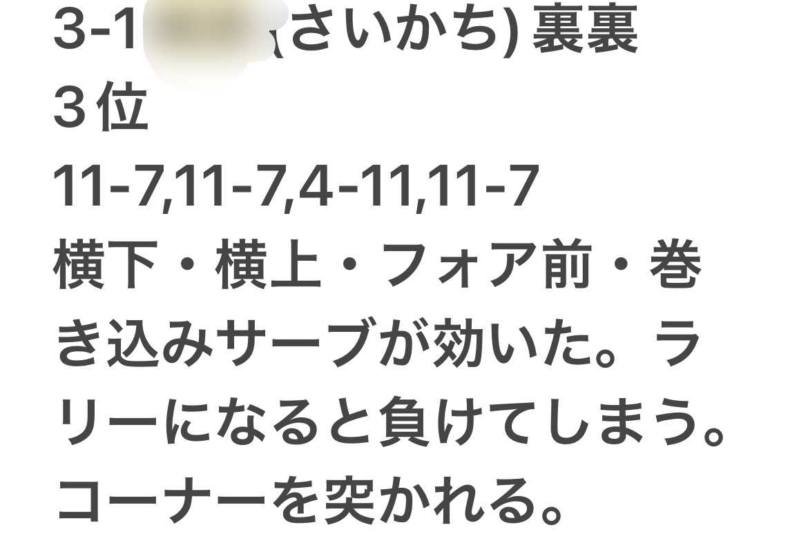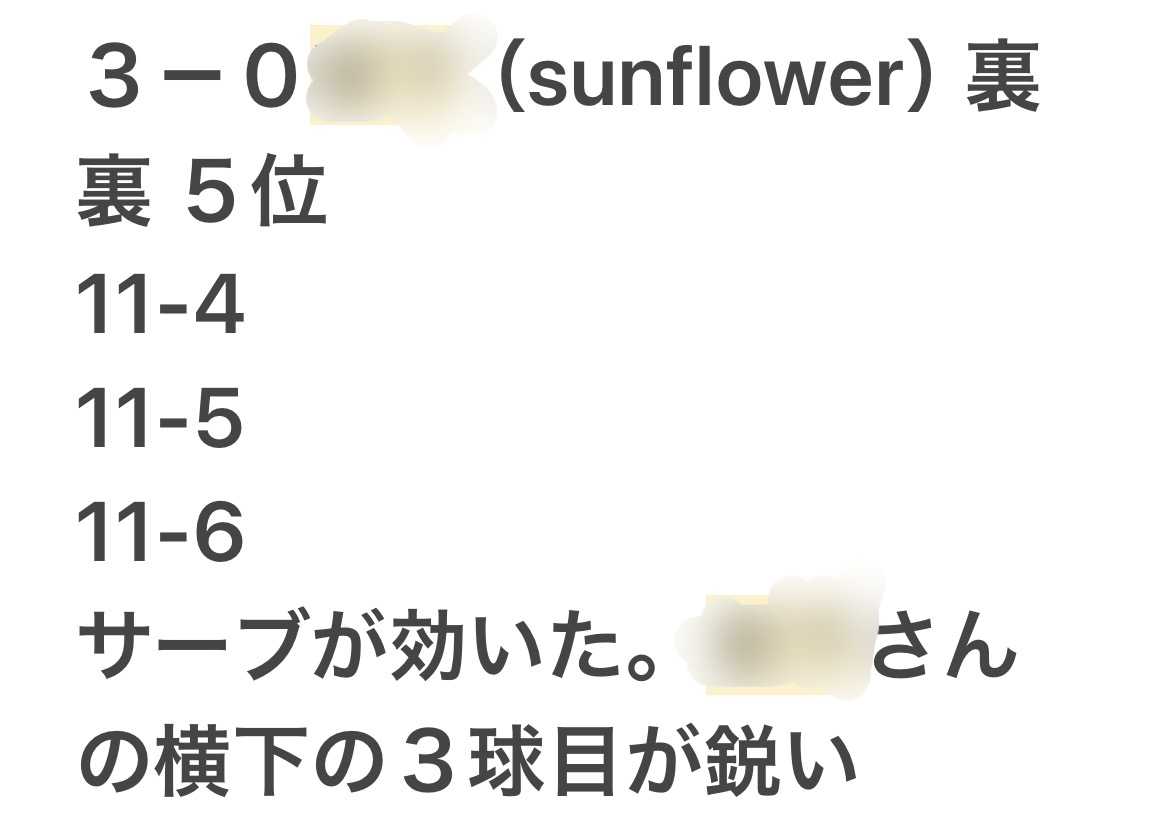 Hさんからの実況報告で、 Mさんにサーブが効いて勝てたらしい。フォアから出したナックルサーブだそう。