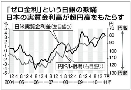 保険を見直せば、 「月に1万円の節約」 も可能です! にほんブログ村 「超円高」の真相!実質金利は「米国+4%前後」日銀官僚と言えば、超優秀に違いないと、新聞記者たちの多くは内心で思っている。日銀も心得たもので、不勉強な記者をミスリードする。その典型例が、「ゼロ金利政策」である。日銀は2010年10月に短期金利の誘導目標水準を「0~0・1%程度」とし、「実質的にゼロ金利政策を採用していることを明確化した」(日銀の発表文から)と宣言した。日経新聞はひんぱんに「日銀はゼロ金利政策を維持している」と書く。が、大誤報である。まず第一に、日銀は金利を名目ゼロにするつもりはまったくない。というのは、当座預金は利息ゼロが常識なのだが、日銀は08年10月から、ご丁寧なことに金融機関の日銀当座預金に最高で0・1%の利息を付けている。金融機関は当座預金金利以下の金利では他に融通しないし、貸さない。短期金利は0・07%弱から0・09%台で推移している。ここで気を付けて欲しいのは、日銀は「実質ゼロ金利」と明言している点である。実質金利とは、インフレ分を差し引いた金利というのが、経済学上、国際的な常識である。お金というのは、預けたり貸すときに金利が付く。金利はインフレ率より高くなければ、銀行にカネは流れない。実質金利計算のために、インフレ率は国際比較ができる経済協力開発機構(OECD)の公表データを使用した。米国の実質金利と比較すれば日米間の実質金利差が明らかになる。【送料無料】「日銀デフレ」大不況価格:1,680円(税込、送料無料)日本はデフレであり、インフレ率はマイナスである。ということは日本の実質金利は名目の金利よりデフレの分だけ上乗せされて高くなる。日本の実質金利は09年で2%前後、10年には1%前後、今年は0・5%前後と下がっている。だが、米国の場合、インフレ率が10年は2%台、ことしは3%台と高い。短期市場金利は日本とほとんど変わらないほどで、最近では0・1%を切っている。すると、実質金利は大幅なマイナスで、この数カ月間は実に3・5%前後で推移している。ということは、実質金利では日本は米国を4%前後も上回ることが、グラフからも見て取れる。実質金利が高い、ということは、その通貨の預金や、いつでも現金に換えられ安全な国債などの金融資産の価値が高いことを意味する。だから、国内外の投資家はドルを売って円を買う。現在の超円高はこうして引き起こされる。【送料無料】日銀につぶされた日本経済価格:1,575円(税込、送料無料)日銀はどうすべきか。日銀は当座預金利息をまずゼロにして名目金利を文字通りゼロ金利に誘導すべきだろう。さらに、インフレ率をプラスにするまで、お札を継続的に増量する「量的緩和政策」をとると宣言する。すると、米国の投資ファンドなどは、日本はいよいよ脱デフレ策、つまりインフレ率をプラスに変えるつもりだと慌て出し、円買い投機の手を引っ込めるだろう。政治家もメディアも日銀にこれ以上だまされてはいけない。目を覚まし、日銀に実質金利ゼロ実行を迫るべきだ。(産経新聞特別記者・田村秀男)【送料無料】この経済政策が日本を殺す 日銀と財務省の罪価格:756円(税込、送料無料)