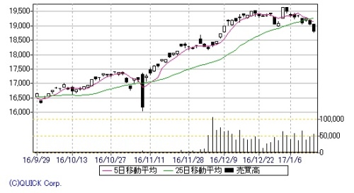 株式投資の専門家の予想の「的中率」はチンパンジー並みCTA(Commodity Trading Advisor=”ロボット”が24時間体制で売買するファンド)チャートは下げ転換を示唆チャートは下げ転換を示唆11月 9日 安値 16,111.81円12月30日 大引 19,114.37円 1月 4日 大引 19,594.16円 1月 5日 大引 19,520.69円 1月 6日 大引 19,454.33円 1月10日 大引 19,301.44円 1月11日 大引 19,364.67円 1月12日 大引 19,134.70円 1月13日 大引 19,287.28円 1月16日 大引 19,095.24円 1月17日 大引 18,813.53円トランプ相場は 追い詰められた金融業界の自爆テロ だった・・・下記は、損失限定で、少額の投資で、億の利益も可能な、宝くじより効率の高い投資手法です。騙されたと思って、一度、ご確認下さい。↓2万6,000円 が 5億3,040万円(2万400倍)になりました。年初の利食い売りが暴落のトリガーに? 次のチャンスも近い?日本株急落「5.23ショック」の“主犯”はヘッジファンドだった225オプション 14日(立会日)で 810倍!225オプション・先物 関連記事