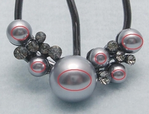 第4回目は「写り込みについて」の対処法をご紹介ます。経験不足でamoもまだ完璧に出来る訳じゃないのですが要点だけでも…まず「写り込み」って何と思うかなこれが「写り込み」した失敗作写り込んでいる部分を赤〇で囲っています。お分かりになりますかデジカメとamoの姿が写ってしまっていますこれが「写り込み」の一例です。光の反射によって写ってしまうのが写り込み。鏡を正面から撮ると当然のことながら自分やカメラが写ってしまいますね。これは光の反射で鏡に姿がうつっているのです。写り込みはこれと同じ事。そしてキラキラ光るヘアアクセは鏡のように反射するので写り込みしやすいのです。ではこの「写り込み」をなくすにはどうしたらいいか・・・その1正面からではなく少し斜めから撮る方法。ただしこれは被写体が平面の物なら大変、効果的ですが上の写真のブラックパールのような物にはあまり効果がありません。その2遠くから撮る方法です。試しに50cmほど離れて撮影してみましたそしてトリミングをしてみましたが・・・こんなに小さくなってしまいましたではサイズを大きくすれば良い・・・と思われるかもしれませんが撮影サイズを大きくするとトリミングした際、画像が荒くなってしまいます。また、この方法で「写り込み」を回避しても細部はよく分かりません。これでも良いという方もいらっしゃると思いますがこんな感じにアップの写真が撮りたい方の為にその3の方法をご紹介しましょう。今回、amoが用意したのはこちら 片面がブラックになったCDケースです。ケースでなくても黒いものなら何でも構いません。黒い紙とか理想です。このケースがレフ板(反射板)の役割をします。更にカメラが少しでも写らない様にフェルトで本体を隠しカバーします。本当は黒紙でレンズ以外を覆ってしまうのが良いのですが黒い紙がなかったので今回はフェルトで代用しました。完全な写り込み防止にはなりませんが・・・CDケースを被写体近くに立てて影を作ります。こんな感じで手前、少し斜め上から撮影してみました。これをトリミングしたものが上の写真です。上から撮る場合、カメラカバーをした方がいいです。カバーは自分の手も隠れるくらいの大きさにして下さいね。手が写ってしまいますから…実はこの写真は何枚も撮りました。フェルトで隠しきれなかったカメラ部分が写り込んでしまったから・・・真上からではなく斜めから撮る場合はカバーしなくてもいけます。撮影位置はこんな感じ(上から見て)この位置で撮影した写真CDケースがレフ板(反射)となって「カメラの写り込み」が無くなったのが分かると思います。この方法は「写り込み」を防止するのではなく逆に「写り込ませる」という方法です。レフ板の代わりとして鏡を使用したりもします。今回は比較的、難しいブラックパールを被写体としましたが被写体がジルコなど白っぽい物の場合はレフ板となる物を白いCDケースや白い厚紙など白色を使用しカメラのカバーも白にすればです。シルバー系の物でしたらアルミホイルを貼った板を使用すると良いと思います。「写り込み」については以上です。今まで色々なご紹介をしてきましたが1枚だけの撮影ではプロでもまず良い写真は撮れません。数打ちゃ当たると言いますが撮影に関しても本当にその通りなのです。amoも1つの被写体で約10枚以上、撮影します。まぁamo場合は少しでも良い写真をご紹介したいと思う勝手な自己満足なので枚数は参考程度に受け止めて下さい・・・。それから言い忘れていましたが「楽天フォト」にアップした後に画像処理はしない方が良いです。何故なら楽天フォトで処理し保存する際、自働に画素数を縮小してしまうからです。折角、綺麗に撮っても画素数が減ってしまっては画像が粗くなってしまいます。若干、画素数を食いますが綺麗な写真をご紹介したい場合は楽天フォトで処理せず前回、ご紹介した「JTrim」で処理してからアップする事をお勧めします。撮影については取り合えず今回で終了です。何かご要望がありamoの分かる範囲でしたら、またご紹介したいと思います