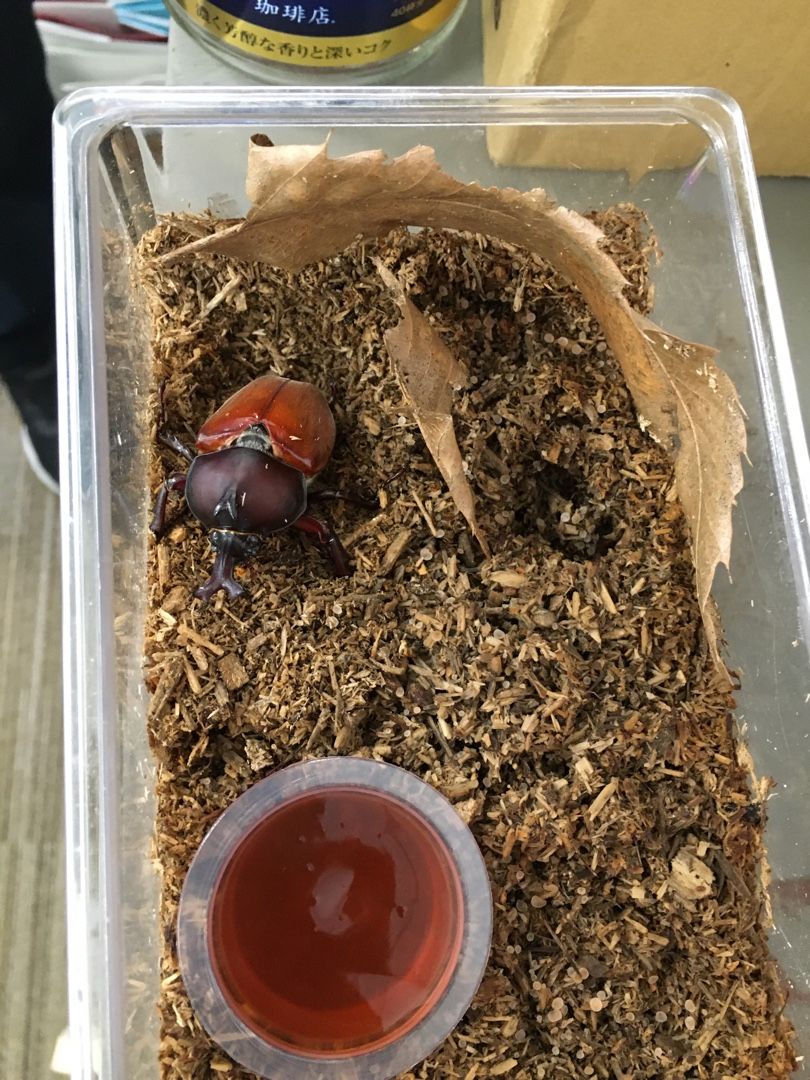 職場でカブトムシの幼虫を みんなで飼ってたのですが ついに今日・・・ 成虫になりました! クリアケースの横から たまに見える幼虫が 最近いっこうに姿を見せなかったので もしかして 死んじゃったかな?? ってみんなで心配してたのですが 今日ついにです。 今日お休みだった上司に LINEで報告し 「よくやった!」 とのお褒めのスタンプを いただきました笑