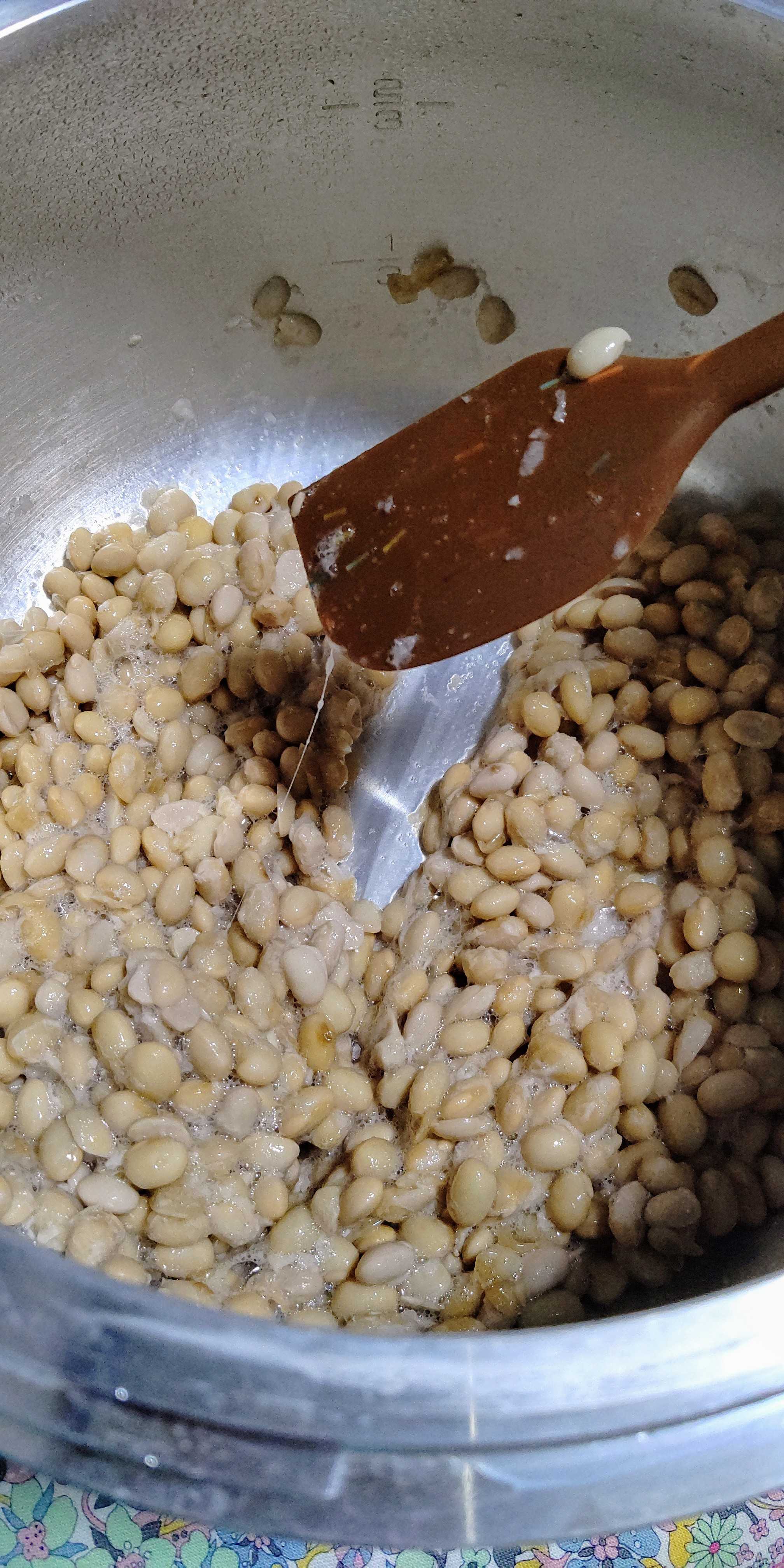 次作るときは圧力鍋に蒸し器を入れてその上に種付けした大豆を乗せて、水分が底に落ちるように底上げ方式で試してみます!