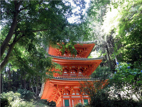 岩船寺(がんせんじ) 高雄山(コウユウザン)報恩院の山・院号を持つ真言律宗(総本山・西大寺)の寺院で、京都最南端木津川市加茂町にあり付近は当尾(とうの)と呼ばれ多くの石仏群で知られています また関西花の寺25ヶ所霊場のうち第15番岩船寺はアジサイの名所とされ「アジサイ寺」と呼ばれています 奈良時代729年、「東大寺の四聖」と謂われた僧行基(ギョウキ)が建立した阿弥陀堂が前身で、ご本尊には平安時代の阿弥陀如来坐像を祀ります ↑「山門」 簡素な造りの山門です ↑「石風呂(岩舟)」 山門前にある石風呂は鎌倉時代に巨岩をくり抜いて造られた石槽で僧侶が身を清めたものとされ、縦2m・横1mで岩舟は寺号の岩船寺の由来とも謂われています ↑山門に立つと境内すぐそこから紫陽花の花咲き誇っています ↑「石室」 高さ2.2m石造りで前両側の角柱に寄棟の一枚石の屋根をのせ、竉内下に水を湛えています ↑石室内の不動明王立像(石室とも重文)、年と共に風化をうけて少し不明瞭になっていますが、1.2mの花崗岩製で薄肉彫りの不動明王が彫られています、鎌倉時代の僧・盛現が自らの眼病が夢に現われた不動明王の加護により平癒したとして自刻し建立されたもので、爾後眼病平癒の信仰が厚く沢山のお詣りがあります ↑「厄除け地蔵」 やはり鎌倉時代の作で真言密教の修験道による修法が行われた所です、また現在も厄除け大護摩供へが毎年3月に行なわれています ↑「五輪塔」(重文) 鎌倉時代の石塔で、五輪塔は古代インドの五大思想、下から方形は「地」、円形は「水」、笠形は「火」、半月形は「風」、宝珠形は「空」を現し、宇宙を構成すると考えられた五大要素を現わしたものとされています ↑「三重塔(重文)」 初代は平安時代825年建立 ↑「十三重石塔(重文)」 鎌倉時代1314年建立 現在の三重塔は室町時代1442年の再建によるもので、四方三間・本瓦葺で高さ18.3m二重折上小組格天井、相輪は鉄製、近年2003年に修理が施されて朱色に塗りかえられ、内部の壁画壁面の復元も行われています 十三重石塔は高さ6.2mの花崗岩製で、四面の軸石には金剛界四仏の梵字が薬研彫りで刻まれています、匹敵する石塔としては奈良・桜井市にある談山神社の十三重石塔があり共に有名です ↑三重塔内来迎壁の十六羅漢図 ↑扉裏の右・帝釈天,左・伊舎那天ノ図 堂内は鮮やかな極彩色で彩られこの他五大明王・八方天像・真言八祖の像等が描かれています(2003年復元のもの)、内部は通常非公開です(写真は当寺資料より) ↑「隅鬼(天邪鬼)」(重文)三重塔四隅の垂木を支えるユーモラスな木彫です ↑三重塔と本堂・十三重石塔に囲まれた「阿字池」に咲き始めた睡蓮です ↑阿字池の向うは「本堂」です、本堂は1988年に再建されたもので本尊阿弥陀如来坐像ほか貴重な仏像が多数納められています ↑中央は阿弥陀如来坐像(重文)ほぼ3mの欅の一本造りで平安時代の作、四方には鎌倉時代作の四天王立像です ↑右は普賢菩薩騎象像(重文)平安時代作の白象に乗る楠一本造りの彩色像、左は十一面観音像で鎌倉時代作 (本堂内撮影不可で写真は当寺資料より) ↑アジサイの花当尾の山肌に添って登ります ↑三重塔を背景にして、池端の紫陽花見事に咲いています ↑こちらは十三重石塔とあじさいの花のコラボレーションです ↑参道にも目いっぱい咲き誇っています ↑こちらは色合いの綺麗な紫陽花です ↑右上より時計回りに色合い深まってきています ★ 夏 今の彩り・花菖蒲・紫陽花・睡蓮はTopページにUPしていますホームに戻りご覧下さい ★「京都ええとこ」一覧と「京都の花」は右サイド欄からご覧下さい-----------------------------------------------------------------JR大和路線 「加茂駅」下車 コミュニティバスで16分(本数少なし) 岩船寺下車すぐ岩船寺関連HP URL---http://hana25.com/?page_id=229 (岩船寺HPはありません)-----------------------------------------------------------------被災地に届けよう! 【京都】老舗や名店がひしめく古都。お土産や名産品をお取り寄せ!ーーーーーーーーーーーーーーーーーーーーーーーーーーーーーーーーー[メッセージはこちらから]