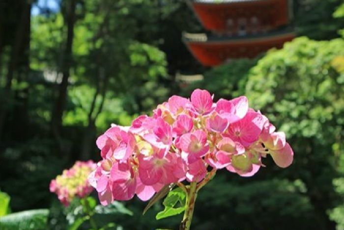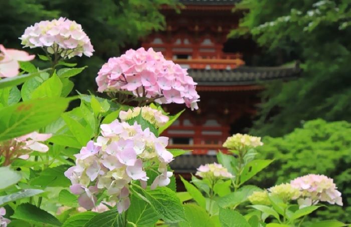 ↓奥の山裾に建てられている三重塔と、中央にある阿字池の周りや山裾にかけて35品種・5000株の紫陽花が育てられています