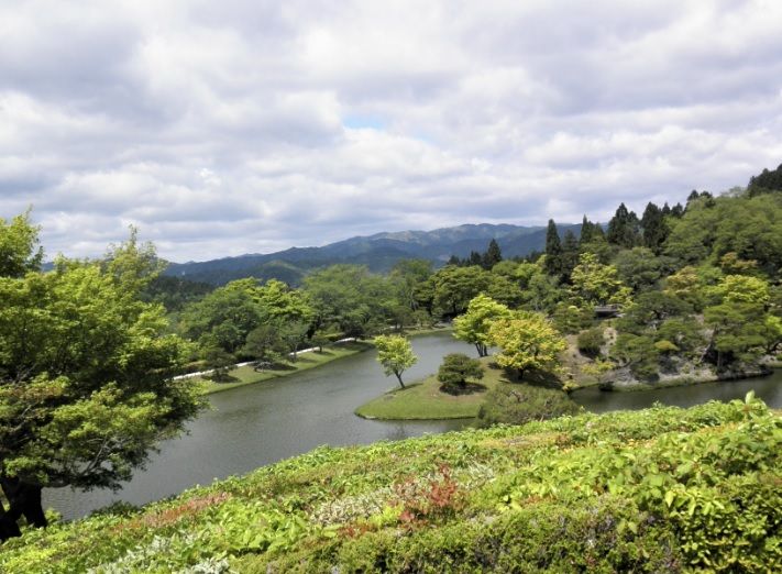 離宮は、上(カミ)・中(ナカ)・下(シモ)の三っに分けて点在し、総面積54万5千平方メートル(東京ドーム11ヶ分に相当します)を超える壮大な園庭が拡がります、また山裾に広がる離宮は上と下の離宮の標高差は40m近くあり大小の滝に加え小川が流され、水の音を絶えず聴くことができます