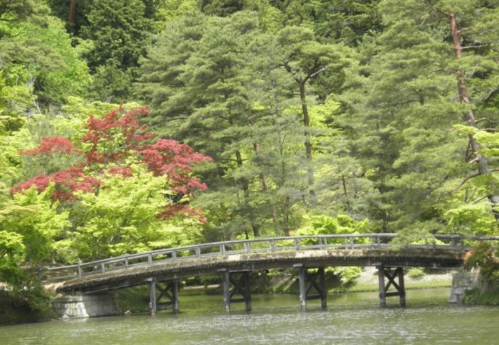 ↓「楓橋(カエデバシ)」中島へ渡る短い木の橋で 三っある橋中で一番短い橋です、この木の橋周囲のみどり色に染められています