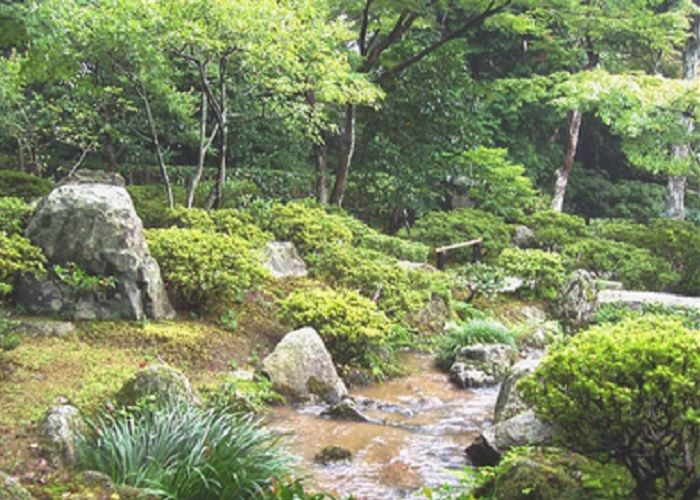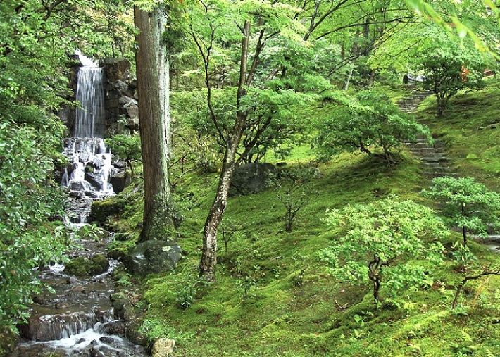 ↓一面の青苔の庭に滝水が流れ落ち小川となり流れ下ります