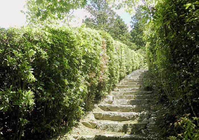 ↓斜面を登る通路は両側背の高い植え込みに導かれ石段をのぼります