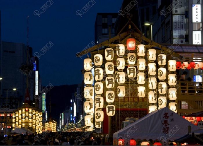 ↓四条烏丸の交差点から四条通り西を望みます 手前「函谷鉾(カンコボコ)」で向こうは「月鉾」の灯りです
