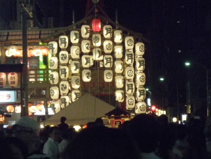 ↓月鉾から左方函谷鉾とその向こう小さい灯りが長刀鉾です 最初の写真の四条通り反対側からの写真です