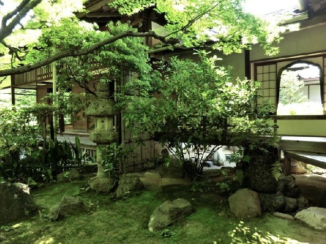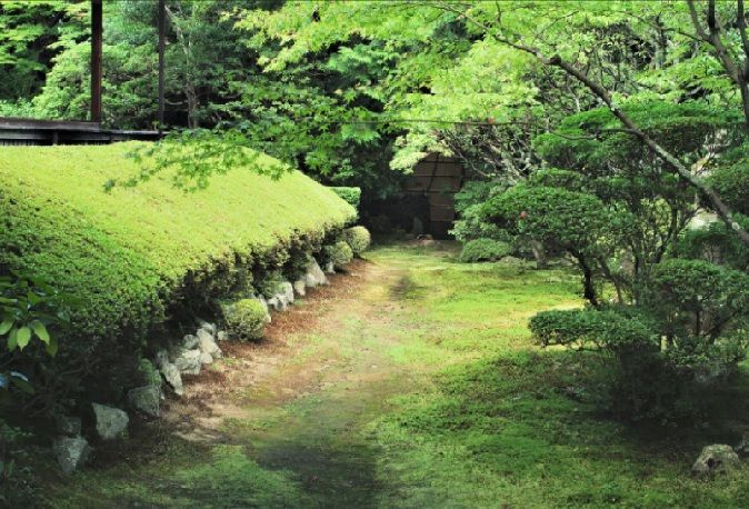 ↓生け垣の南側、青々した苔庭が広がります