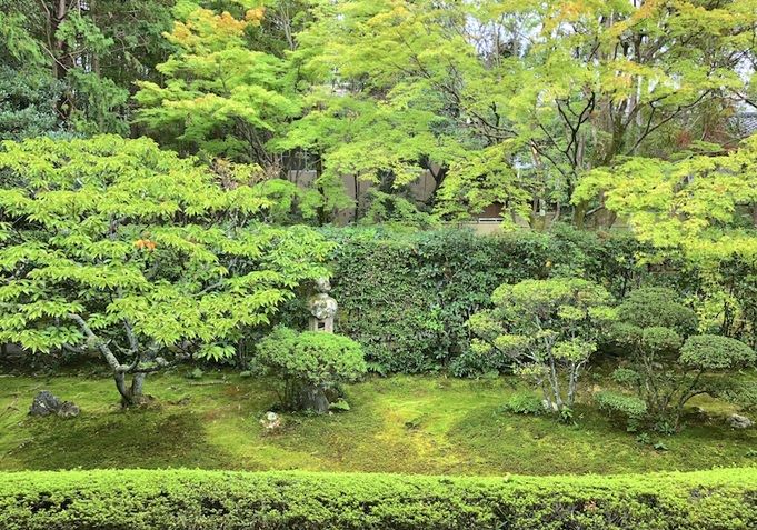 ↓庭正面です 縁先より南に低く造られた真如の庭は最も大きく大刈込が特徴的な庭となります 生け垣の向うも苔庭です