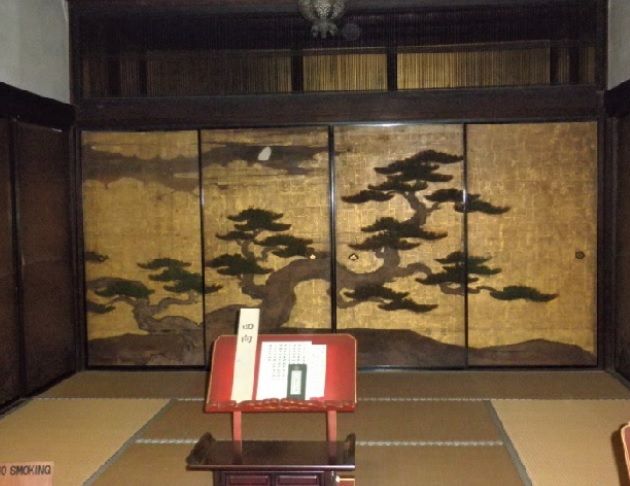 ↓方丈襖絵「金碧松三日月図」狩野山楽の弟子狩野山雪の筆で、かっては仏壇背後に貼られていたものが襖絵へと改装された様です 上に三日月が光ります