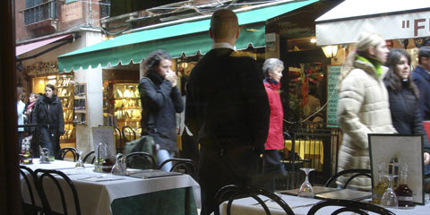 2006.02.17 6:00ヴェネチアのマルコポーロ空港に無事到着、荷物もスムースに出てきてホッとしたがゲートを出たところに待っていたHISの現地ガイドが「他の客も待っているが飛行機が遅れている。1時間ほど待ってほしい」と言う。やむを得ずバールで暇をつぶすが現在日本時間の朝6時、家を出てから22時間経過している。やはりドアツードアで24時間はかかりそう。