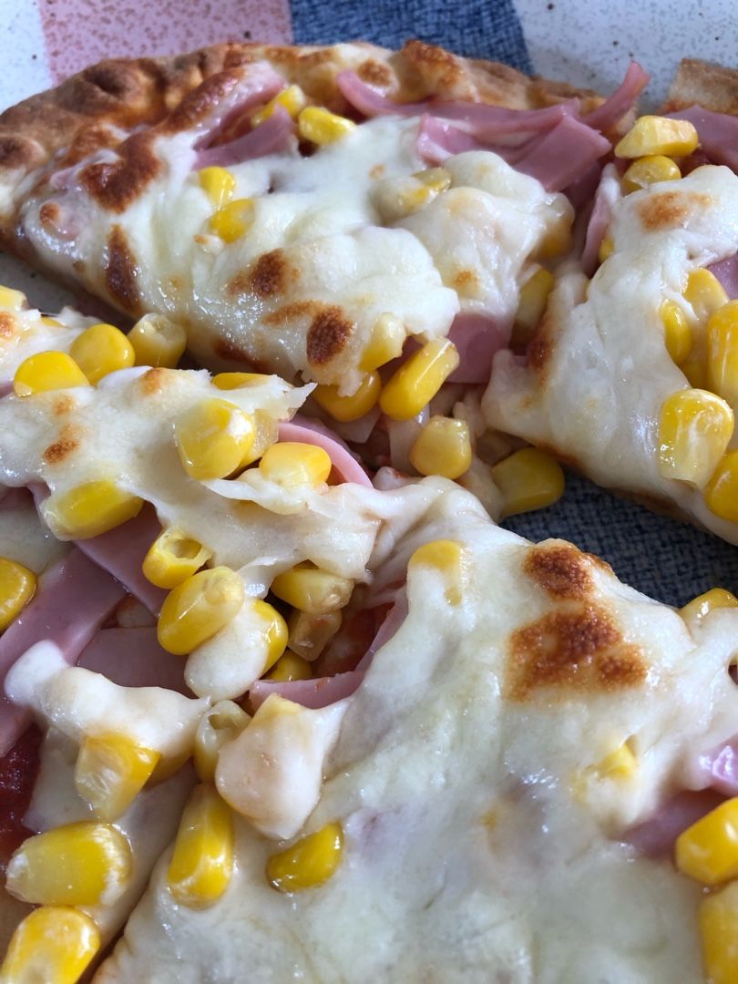 冷凍のナン・コーン・ピザ用チーズを購入し1枚目はハムを+2枚目はさらに産直のアスパラ+自家製赤玉ねぎのスライスをトッピングして完成。すぐに焼けて美味しくできた