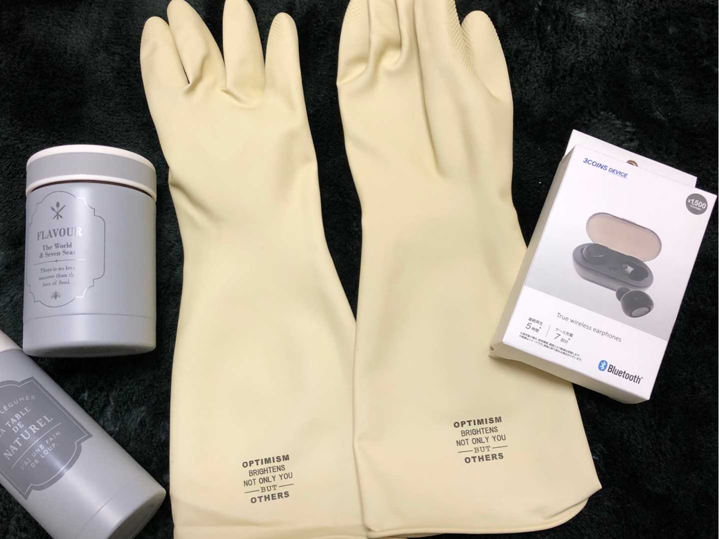 一個、貸したまま戻ってこないスープジャーの代わり。雑誌の付録になってた200ml程度のステンレスマグボトルを、どうしようか?ってずっと迷っていて雑誌は要らないわけだし・・・と購入。厚手のゴム手袋。これからの季節は洗い物すると手が痛いのよね。あとはワイヤレスイヤホン。ジムに行くとき、コードがあると危ないからね~。