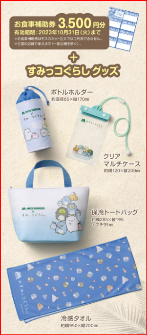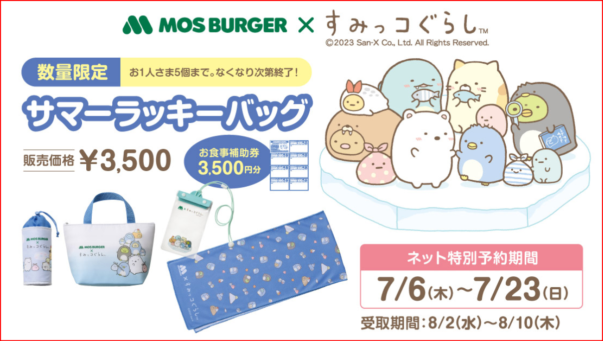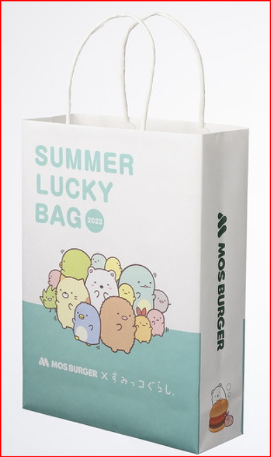 モスバーガーの夏の福袋『サマーラッキーバッグ』 毎回キャラクターとのコラボ福袋が登場し、これが実質無料?! と嬉しい悲鳴が聞こえてくるモスバーガー福袋。 今回のコラボはなんと大人気『すみっコぐらし』 正直、これが実質無料なんて信じられないくらい充実したラインナップですよ! さっそく見ていきましょう。