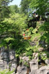 東北ツアー ツアー名称は「みちのく秘湯秘境周遊5日間」日記のタイトルもこれで行きます伊丹空港7時10分集合せよとのことで 5時40分に家を出 阪急まで20分あまりとことこと歩いて モノレール乗り継ぎ到着ですANA機で 9時過ぎ仙台に もし1週間ほど出発がずれていたら あのPC故障による大混乱 どうなってたんでしょうかねバスに乗るとビックリ 車内超満員 一番後ろの5人掛けシートも埋まってます さすがに急ブレーキをかけられたら 一直線にフロントガラスまで吹っ飛ぶ 真ん中の席は空いてたけど年齢層は 見事に じいちゃんばあちゃんで一杯 私達が最若年クラスとみましたこのツアーのいいところは 定番の 十和田湖・奥入瀬渓流・山寺・中尊寺などには行かないところ松島には最終日行ったけど これはあくまで飛行機搭乗までの時間つなぎでしたなかなか 通常のツアーでは行かない(あるいは 行けない)観光地を巡るのが人気の秘密らしい満員のバスは 窮屈感一杯でしたが 窓の外は素晴らしい景色 で解放感一杯新緑の薄緑が目にまぶしく 田んぼは田植えの真っ盛りまず寄ったのが「厳美峡」甌穴が見られます それと 「ああTVで見たことがある」と思ったのが 川岸にある篭に 代金を入れ合図すると するすると ロープで対岸の饅頭屋に引き寄せられ お茶と饅頭が戻ってくる風景 (川を越えて 戻ってくる篭)400円で 6個串刺しの ゴマ 小豆 みたらし 3種はいってました(写真なし)ついで バスは 岩手 秋田の県境にある 栗駒山に上っていきます まだ雪が残っていて 好天のもと素晴らしい景色標高1100mの一軒宿 須川高原温泉「栗駒山荘」で入浴を楽しみました 雪の残る栗駒山荘 パンフより転載露天風呂は 高台にあり 目の前は さえぎるもののない雄大な景色 青空と新緑と残雪 言うことなし お勧めです「子安峡大噴湯」に立ち寄ったが 迫力ある景色は 300段の階段を下りなくてはならず 橋の上からチラッと見ただけで終了 一路男鹿半島に向かいました男鹿半島 40年前に訪れたけど 覚えてません 男鹿温泉 昼の温泉が良すぎて 印象薄し 夕食 超高温に熱した石を 魚を入れた桶に放り込み一瞬に蒸しあげる調理を披露していました出来上がった魚を 取り分けて振舞われていたけど なにせ43名 最後のほうにいくと どうやら足らなくなったらしく 必死に桶の中を探し回っておられました次回は 世界遺産 白神山地と 今一番人気の秘湯を巡ります