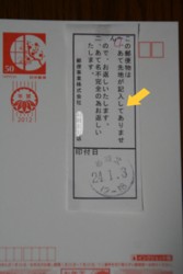 昨日は 冷たい風が強く吹き 午後には小一時間ほど雪が降り荒れていた今朝も寒いデスそして昨日はジム始め 知り合いと挨拶をし 軽く体を動かすのみで終了さて年賀状 出す枚数も 受け取る枚数も年々減ってきているその中で一人 学生時代の仲間 もう何十年も年賀状のみの付き合いとなっているけど彼は現在 仙台市内在住で津波の被害を受けた地域から遠からずの住所健在は信じてはいたけど 賀状を出していいものかどうか迷い結局出さずところが元日 彼から元気な賀状が届けられたヨカッタ! 早速喜びの一筆を書き加え元旦に郵便ポストへそして3日 次のような付箋を貼られ 我がもとに返送されてきた 「この郵便物は あて先地が記入してありませんのでお返しいたします アホンダラ! 」他にも何枚か一緒に返信したけど これだけは別にして一筆加えたその時 喜びのあまり住所を印刷するのを忘れてしまったんですな 反省!元気だったんだから まぁご愛嬌としておこう