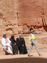 あと20~30分で2日目突入となる23時30分発のエミレーツ機で ドバイに向けて出発今回のツアーは関西・関東合同で 成田組が20名 名古屋組が1名 我ら関空組が8名 計29名 乗り継ぎ港ドバイ空港で合流することに 添乗員は成田組についているので 関西組はかってにドバイまで行かねばならぬ おまけに集合してからいくわけでないので だれが仲間なのかさっぱり分からず(一人だけ判明)ともあれ ドバイに順調に着陸 でっかいドバイ空港で 次のヨルダン・アンマン行きのゲートがまだ未定となっていて おろおろしかけたが 隣席だった エチオピア在住の国連関係で働く親切なお嬢さんのおかげでなんとか合流地にたどりつけたアンマン行きの飛行機に乗るため バスで空港内を20分走り回るその間暇なので 隣のお嬢さんと懇談(撮影はお母さんの了解済み) お嬢さん 右手の先にきれいなペイントを施してました関空~ドバイ 10時間弱 乗り継ぎ休憩3時間弱 ドバイ~アンマン3時間でヨルダン・アンマン到着昼食後 さらにバスで砂漠を200km爆走!初の観光地「リトルペトラ」(紀元前2世紀ごろの住居跡)で約1時間散策少々歩くのがしっかりしなかったけど 単に長旅の影響と思っていたが でこちゃんから体がかなり暑くなっているとの指摘が ともかく近くにある本日のお宿へ続く
