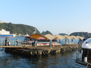 紀州・勝浦温泉のホテル浦島の名物風呂「忘帰洞」とはどんなもんか探るべく 車で新名神・伊勢自動車道などを経由して4時間あまりか 半島にあるホテルには連絡船で行きます客室数805室 一日最大3000人は泊まれる 日本最大級のホテル(らしい) 連絡船は満員 理解できない言葉を話す団体さん多数 私好みのホテルではないけど一回ぐらい経験するのもいいでしょう混まないうちに 風呂に直行 風呂場は6か所あるが とりあえずは看板商品「忘帰洞」へ(HPから)巨大な岩盤をくりぬいたでっかい風呂から見る熊野灘は絶景 人気のほどがわかります次いで入ったのが「玄武洞」 (HPから)「忘帰洞」に比べると少し規模は小さいけど 海面に近く おりしも強風が吹き荒れ 風呂場にたたきつけられるな波しぶきが大迫力でした食事は朝夕ともバイキング これもまたよし
