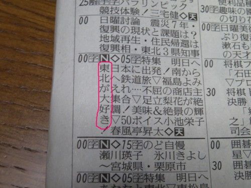 ご無沙汰です先月終わりから ずっと風邪をひいてました熱とか咳が出て 2回インフル検査をして2回とも陰性宣言(でこちゃんは 私の検査前に見事インフルエンザの宣告を受けていた)寝込むほどではなかったけど 先々週はスポーツジムは全休先週は行ったけど かなり手を抜いての運動でした今は喉以外ほぼ完治です急に話は変わるけど 昨夜ネットニュースなどを読んでいたら昨日(3月11日)のTV番組紹介欄で NHKさんの震災への思いが詰められている とのニュースさっそく観てみるとなるほど 先頭の文字を縦につなげると東北への応援メッセージが組み込まれていましたすばらしいですね