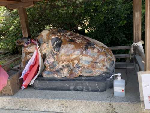 境内に入ると 有名な「撫で牛」さんにも ばっちりコロナ対策が