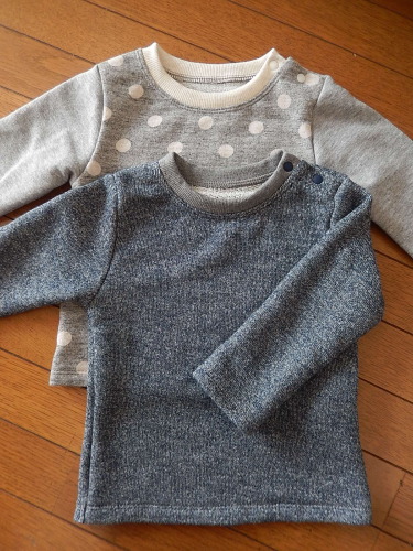 CIRCOさんの無料パターンで80サイズの型紙いろいろ見比べ、大きそうなの&作ったことのないタイプをごく普通の、一般的なかたち肩あき仕様に変更パターン CIRCO 会員限定☆無料パターン いつものTシャツ 80サイズ生地 ミニ裏毛 杢ネイビー/グレードット(メルカリ) スパンテレコ(生地と雑貨のお店 PERURU他)肩あきは、「クライ・ムキのLaLaLa 5 ロックミシンで作るベビー服」を参考に。ラグラン袖の時ほど悩まず見た目はラグランのほうが好きかな衿ぐりはロックミシン後カバーステッチ袖口・裾カバーステッチこちらの型紙、大人服を小さくしたようなしゅっとしたラインかと袖を折って着る感じのサイズ感、長く着られそう次回は袖丈5cm位短めにしよう成長したら切替をつければok肩あきなくても着られるかな?と期待したけど、無理っぽいしばらくは続く肩あき仕様肩あきの段差(衿ぐり布との)が気になるのだけれど、こんなもの??娘も、とっても喜んでくれた。たくさん作るね。ありがたや、無料型紙お洒落な服が多い感じのパターンショップとお見受けしました。メルカリで購入した生地おそらく有名子供服生地ショップのものネイビー杢の生地、滅茶苦茶ふわふわ柔らか初めての柔らかさ&気持ち良さ。どこの生地か気になるスパンテレコも多数ショップで購入してみたけれどPERURUさんのが一番いい感じ子供には、シンプル普通の動きやすいデザインで着心地の良い生地・パターンで作るのがいいのかななんて思いながら
