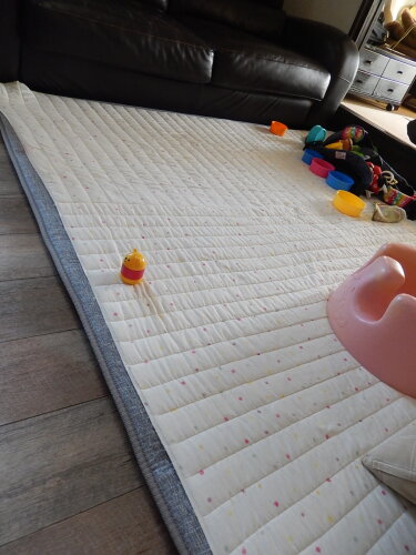 キルティングで簡単に生地 イラストレーター 芳野さんデザイン ガーゼ キルティング生地 dot yoshinoドットの中に模様、全体に薄イエローの柄ものすごく可愛らしい生地いつだったか、孫が我が家の床で頭を強打し対策にプレイマットを買おうと夫価格と見た目で、ラグに変更よだれ対策&なめてもいいよう、カバーを作ることに購入数日後に来るというので、在庫布の中から水通しもせずに急いで作る用尺ギリギリ、しかも継ぎ接ぎ端ロック始末のまま、縦横入り乱れ四隅ゴム仕様(適当)洗濯したら縮んでしまい、あ~あ大事にしていた生地なのに長い間仕舞い込んでいたものが形となり目にすることができ嬉しいから、良しとしよう。部屋の中も明るい雰囲気になったかなびっくりするほど高いけど、こんなの欲しかった