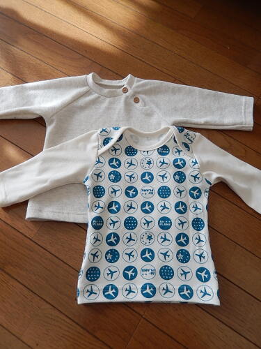 肩あきに悩みつつラグラン袖とクロスショルダー70サイズパターン、なかなか見つけられず「クライ・ムキのLaLaLa 5 ロックミシンで作るベビー服」の中から6 ボディオール を Tシャツに(80サイズ)7 ロンパース を ラグランTシャツに(70サイズ)生地 飛行機柄スムース(メルカリ) 60/-スムース生成り(Wildberry) 綿100% 接結ニット(メルカリ)気合いのいるバインダー「ラピートテープで簡単バインダー始末」とあるラピートテープ、あったよね三つ折りで厚み出ないし、カバーステッチ仕上げならいいかも・・・あると思っていたラピートテープが、ない!がーーん仕方なく待ち針でとめ、やってみるも散々結局、ふらっとろっく四つ折りバインダーで裾・袖口はカバーステッチ袖口は、最初にやっておかないと苦労する「ボタンあき」小さなベビーサイズには必須初めてなので、よくわからないままに何とか完成アラ隠しに、ボタン風の可愛いスナップボタン割高だけど、見栄え良し。使うの2個だもんね出来上がり、あまりの小ささに頭入る? 不安に身長70cm位、70サイズの服のサイズ感やいかにサイズ感を知りたくて、70と80で作ったけれどほぼ一緒? デザインによるゆとりの違いかな先日渡し、着てもらったところ「ぴちぴちっぽいけど可愛い」ぶかぶかでもピッタリでも、動きにくいよねぇ成長の早い子供の服作りは悩む子供服を作るなら、かわいい生地でと探してみると、有名ショップの素敵な生地は高い大体50cm1500円位!?そこで、メルカリの出番、ありがたや大きめスタイやサッキングパッドのリクエストいただきバインダー克服&ボタンあき好きになれるように、頑張ろう