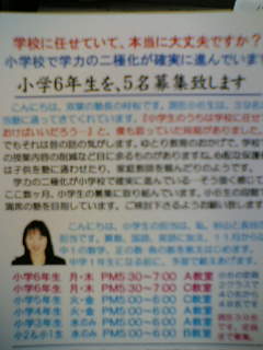 10月中になんとか100名を達成させたいと考えている。大手の佐鳴学院さんの立派なチラシと、僕の印刷した手作りのチラシが昨日同時に入った。 さすがに大手だけあって輝かしい合格実績が載っていた。まぁ合格実績で比較されたら木っ端微塵だが、世の中小さな塾を好んでくれる人もいるので期待したい所だ。 ほかの塾はどうか知らないが、うちは小学生に的を絞って募集をしている。今日体験授業を申込んできてくれたのが3名。現在88名なので3人入ってくれれば91名。あと一息、ニ息だ。。。。