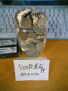 じゃ~~~ん!500円玉500枚達成しました。写真を載せたいのですがメールが使えないので前回の写真です。80枚ふえて500枚です~~~~↓の写真は9月30日撮影の440枚の写真です。 冗談半分始めたのが5月6日。9月30日で440枚ありました。10月22日現在で500枚です。嬉しいです♪♪↓の写真は8月31日撮影の364枚の写真です。■H17年8月末:500円金貨は364枚。可愛い宝物です♪♪☆☆☆目指すは小学生100名、あと9名!!☆☆☆いくぞぉぉぉおおおおぉぉぉぉぉおおおお!!!!突撃じゃあぁぁあああああ!!!■愛機2029。メンテナンスの様子です。大事な戦闘機です。■戦闘機の水洗いには、私の息子も学徒動員しています。☆7月12日に『静岡県ネット』に登録してみました。静岡ネットランキングをポチッとクリックしてくださいね。総合で10位位でウロチョロしています♪♪忘れてはいけない神風特別攻撃隊の武士道。塾版:僕の日誌です♪♪塾版:ミユキ先生の日誌です♪♪塾版:ヒロミ先生の日誌です♪♪