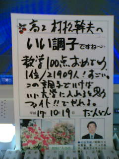 たった今、次男の直樹からメール受信した。以下はメール原文のまま!========================今日の中間テストの英語49点取りました。ちなみにクラストップ。残念ながら社会は43点でした。======================== 心配してたんだな私は。高2の幹夫はこの間の全国模試で数学満点のトップで快調に飛ばしていたので、直樹が失敗すると可哀想だし…と思っていたのだ。まぁ少し安心。 よかった! ほっとした!