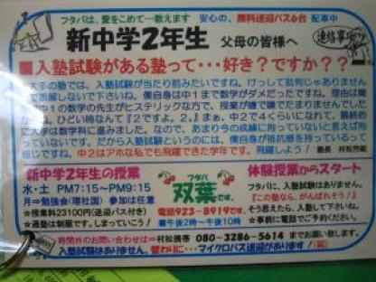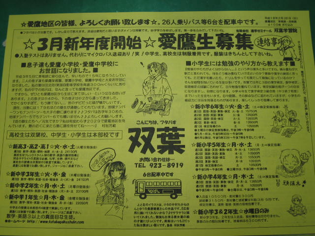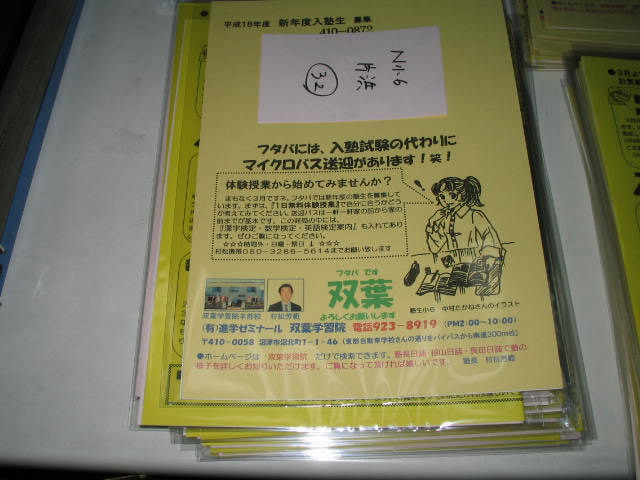 という訳で、『愛鷹地区第1弾』のチラシを新聞店に持っていく。これから毎週日曜日に撃ち込む。 2月26日、3月5日、12日、19日、26日の5連投。 週刊フタバチラシだ~~~ 住宅密集地、ここには軽く1000名の小中学生がいる。高校生も合わせると軽く1500名はいる。 絨毯爆撃!!!だ。■よびりん様の元気の出るプログです!!■愛機2029。メンテナンスの様子です。大事な戦闘機です。■戦闘機の水洗いには、私の息子も学徒動員しています。☆7月12日に『静岡県ネット』に登録してみました。静岡ネットランキングをポチッとクリックしてくださいね。総合で10位位でウロチョロしています♪♪忘れてはいけない神風特別攻撃隊の武士道。塾版:僕の日誌です♪♪塾版:ミユキ先生の日誌です♪♪塾版:ヒロミ先生の日誌です♪♪