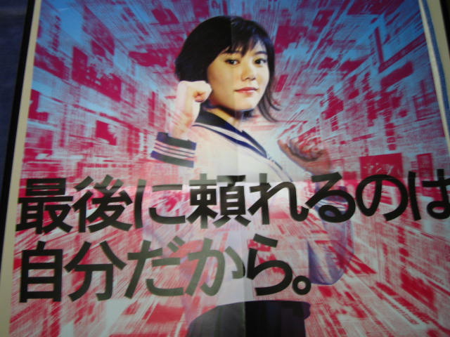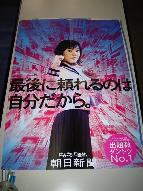 昨日新聞店にチラシ搬入をしてきた。なじみの事務員さん(20年来なのだ~~~)に、『朝日新聞のポスターくんない?女子高校生の奴があるしょ?』 と言ってゲットして来た。なかなかいい感じ。塾に貼ろうっと~~~~~